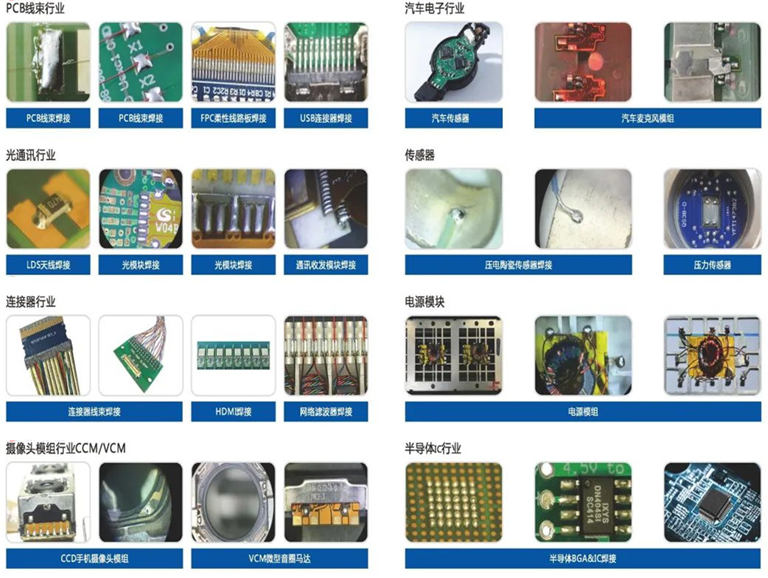 適合激光焊接的材料有SMT后置插件、熱敏元件的焊接、難焊元件、微型揚聲器/電機、PCB修復焊接、手機的各種元器件等。