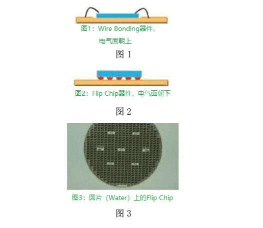事實(shí)上,倒裝芯片之所以被稱為“倒裝”,是因?yàn)榕c傳統(tǒng)的金屬線鍵合連接方式相比(Wire Bonding)這與激光球種植后的過程有關(guān)。傳統(tǒng)的芯片電表面通過金屬線鍵合連接到基板上(圖1),而倒置芯片的電表面向下(圖2),相當(dāng)于將前者翻轉(zhuǎn),因此稱為“倒置芯片”。在圓圈中(Wafer)上芯片植球后(圖3),需要翻轉(zhuǎn),送到貼片機(jī)上方便貼裝,也因?yàn)檫@個(gè)翻轉(zhuǎn)過程被稱為“倒裝芯片”。