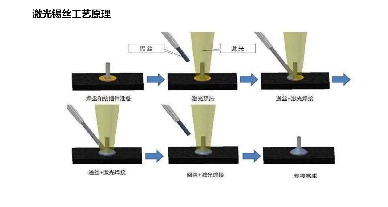 與激光錫膏焊接不同,激光錫絲焊接有一個送絲過程。焊接過程開始前,需要對產(chǎn)品焊盤進行預(yù)熱,然后將錫合金或純錫制成的焊絲通過自動送絲系統(tǒng)送至焊盤位置,用激光束照射,熔化焊絲,與焊接材料連接。