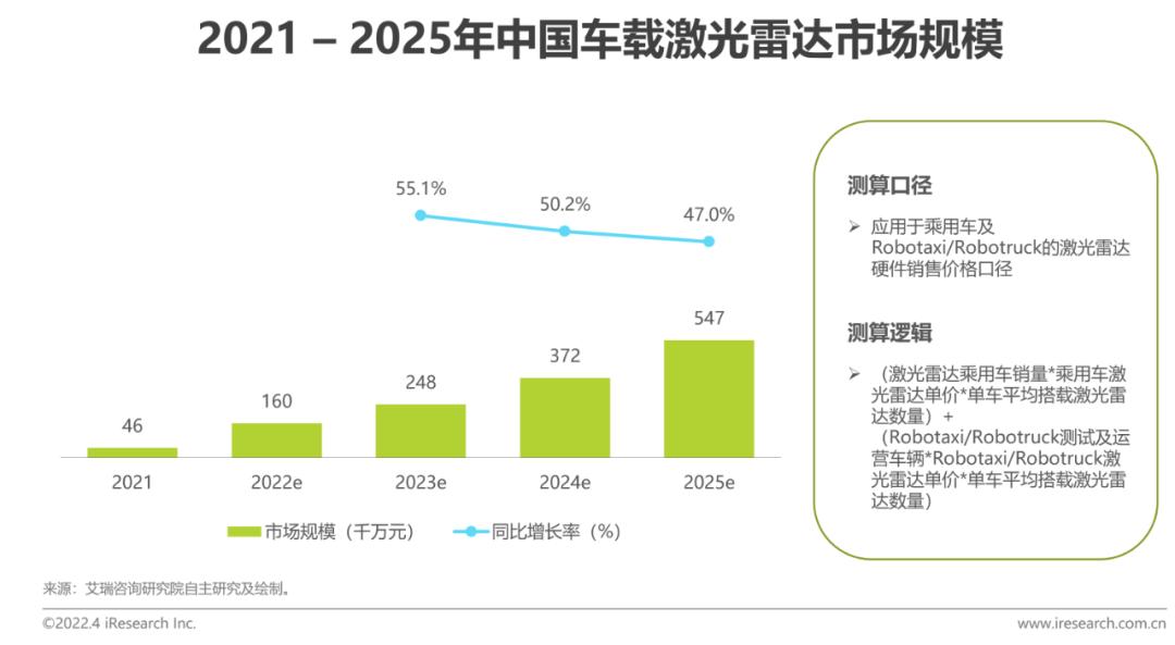 ?隨著輔助駕駛功能的逐漸量產(chǎn),乘用車輔助駕駛系統(tǒng)已經(jīng)成為行業(yè)標準,其單一功能逐漸向低端車型下沉。與此同時,新功能也在高端機型上不斷推出。激光雷達作為輔助駕駛的首選傳感器,過去一直受限于成本和體積,難以大規(guī)模落地。隨著技術(shù)和生產(chǎn)效率的進步,近年來激光雷達的成本開始快速下降,各OEM廠商也逐漸將其納入ADAS傳感器方案。2022年,半固態(tài)激光雷達的成熟將使其在乘用車市場逐漸爆發(fā)。隨著主機廠對激光雷達功能開發(fā)的深入和激光雷達成本的降低,激光雷達搭載的機型數(shù)量將在短時間內(nèi)保持高速增長。Robotaxi也在政府和下游企業(yè)的共同推動下持續(xù)開市,測試運營車隊數(shù)量將保持穩(wěn)定增長。車載激光雷達市場預計將從2021年的4.6億元增長到2025年的54.7億元,實現(xiàn)85.8%的年復合增長率。