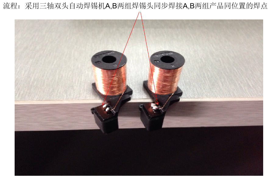 一個(gè)產(chǎn)品共計(jì)2個(gè)焊點(diǎn),分為A&B兩組產(chǎn)品。由同一設(shè)備的A&B兩組焊錫頭對(duì)應(yīng)A,B兩組產(chǎn)品同位置的焊點(diǎn)配合同時(shí)工作;